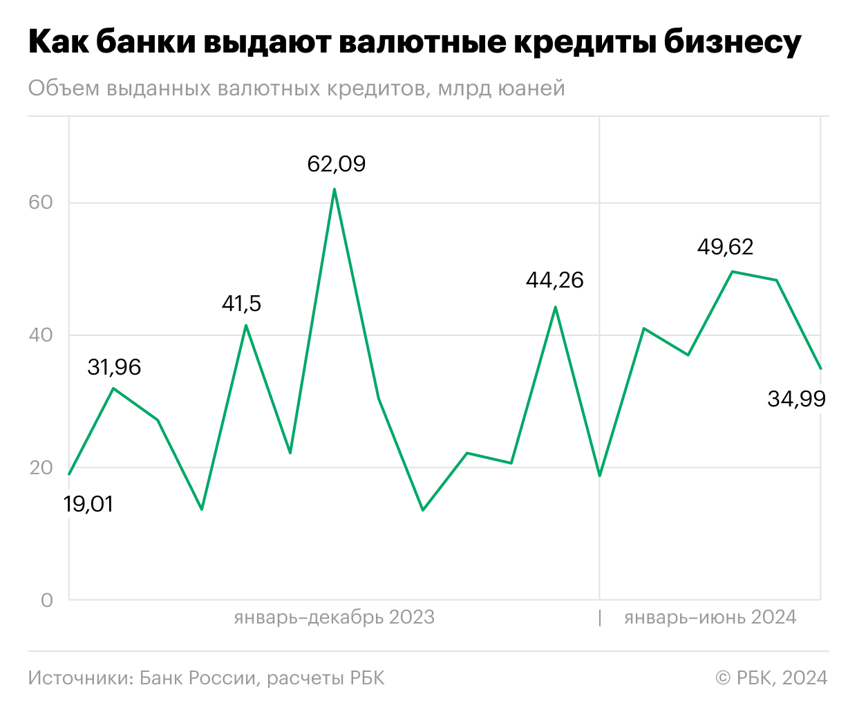 В июне 2024 года российские банки значительно сократили объемы кредитования бизнеса в иностранной валюте, согласно статистике Центрального банка России. В течение месяца корпоративным клиентам были предоставлены валютные кредиты на сумму 420,9 млрд руб., что эквивалентно 34,99 млрд юаней. По сравнению с маем объемы валютных ссуд уменьшились на 27,6%. В абсолютных цифрах июньский объем оказался минимальным с ноября 2023 года, исключая сезонный спад в январе.
