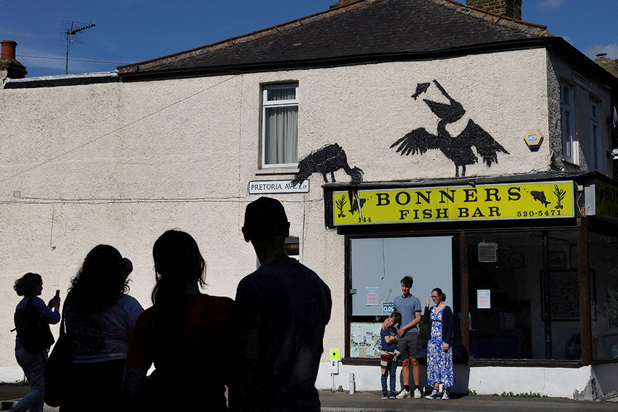 5. Изображение двух пеликанов, поедающих рыбу, появилось над козырьком бара на севере Лондона.