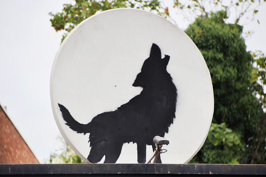 4. Четвертая работа — воющий волк на спутниковой тарелке, которую позже сняли вместе с рисунком. Пресс-служба Бэнкси считает, что работа была украдена.