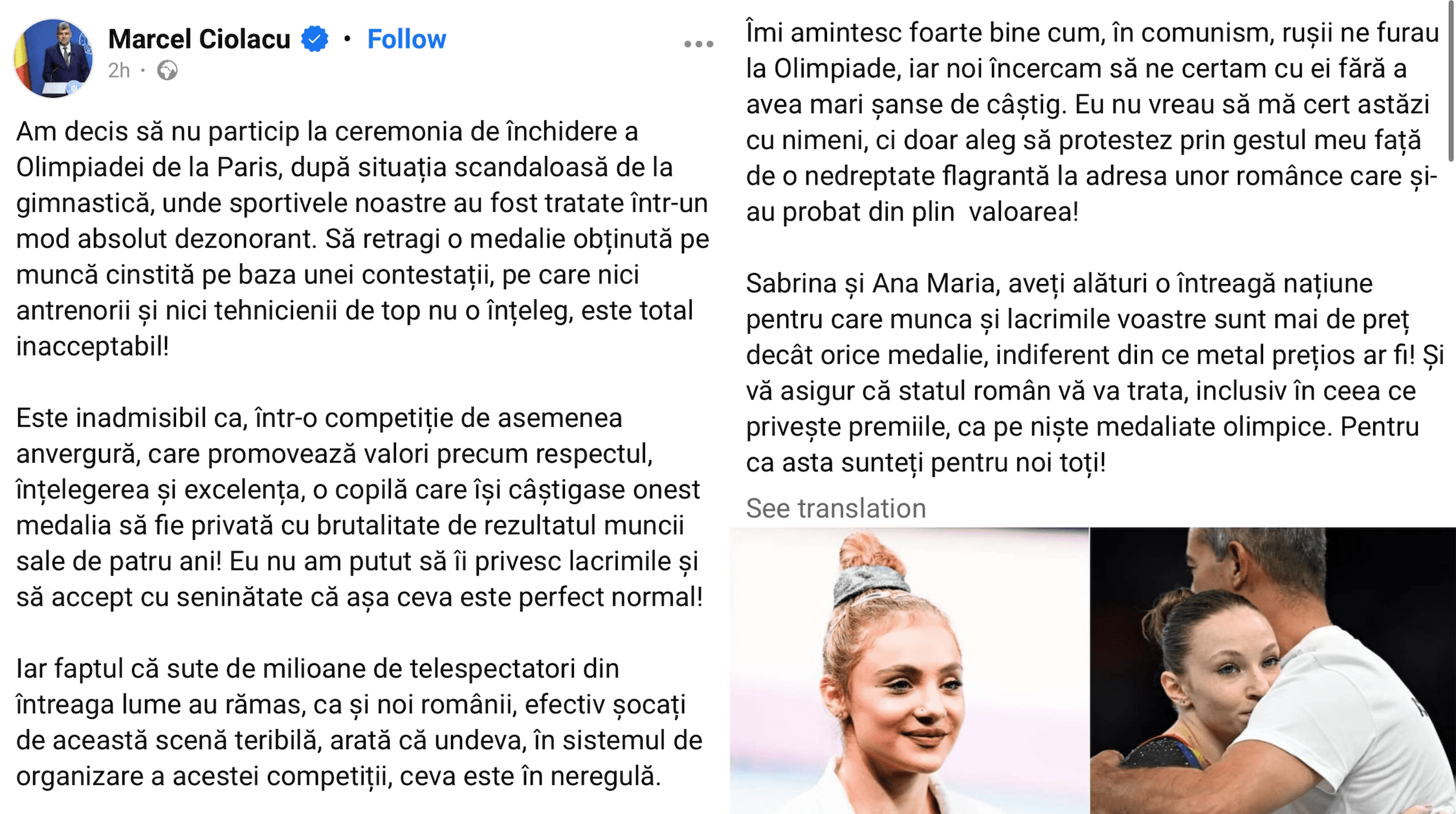 Премьер-министр Румынии Марчел Чолаку принял решение не участвовать в церемонии закрытия Олимпийских игр после спорного лишения румынской гимнастки Аны Марии Бэрбосу бронзовой медали в вольных упражнениях. О своем решении политик заявил на своей официальной странице в Facebook (принадлежит Meta, признана в России экстремистской и запрещена).