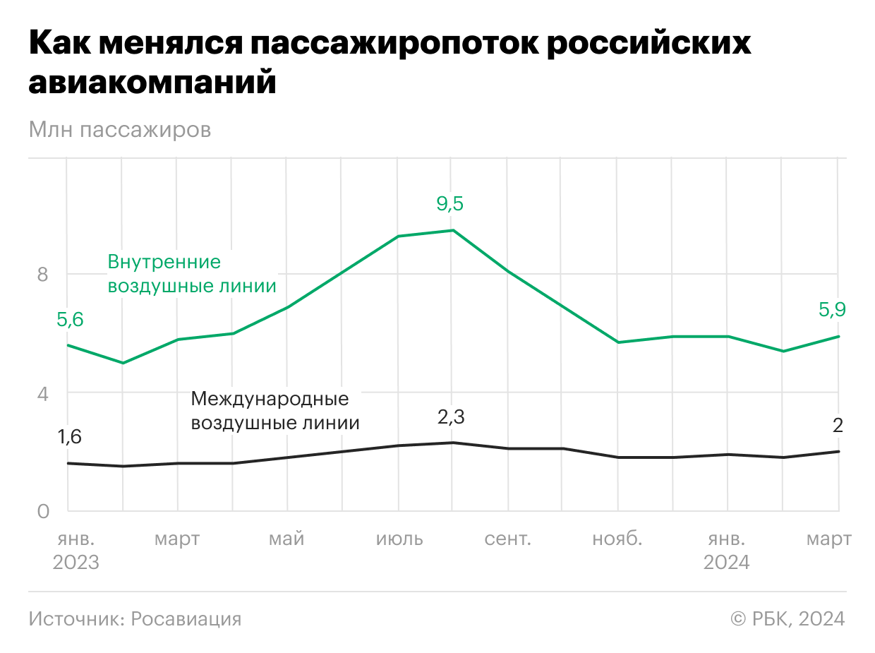 В марте 2024 года наблюдалось замедление темпов роста пассажирского потока на самолетах в России. Количество пассажиров увеличилось всего на 2,6% по сравнению с аналогичным периодом прошлого года. В марте 2023 года авиакомпании перевезли 5,79 млн пассажиров, тогда как в марте 2024 года этот показатель составил 5,9 млн человек.