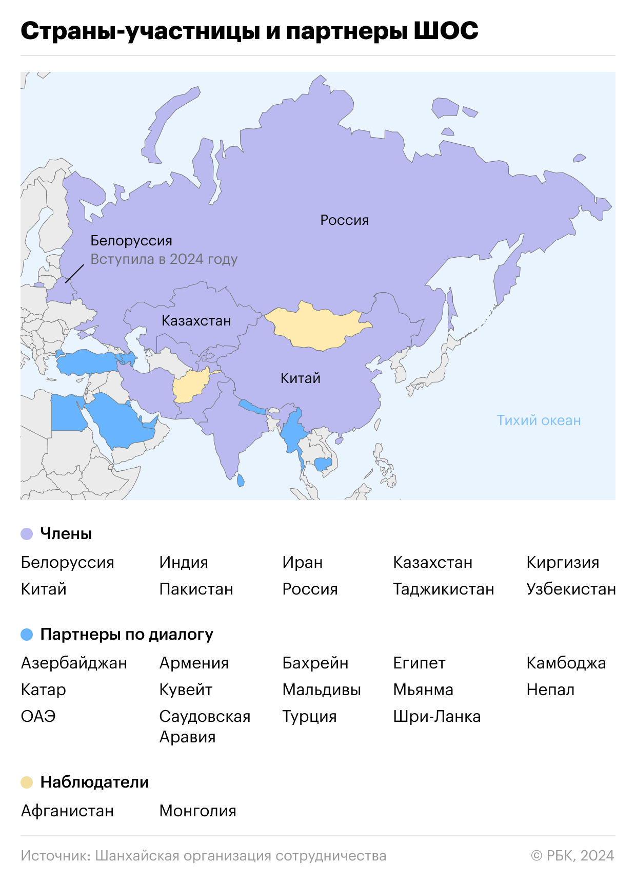 Страны-участницы и партнёры Шанхайской организации сотрудничества. Интерактивная карта