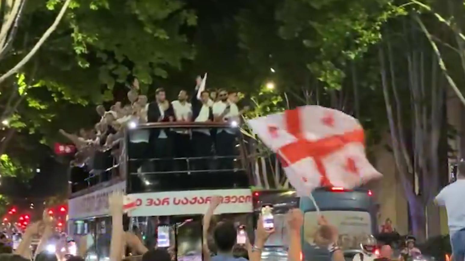 Игроки национальной команды проехали на открытом автобусе по центральному проспекту Чавчавадзе до площади Свободы в Тбилиси. Тысячи болельщиков приветствовали футболистов и тренерский штаб аплодисментами.