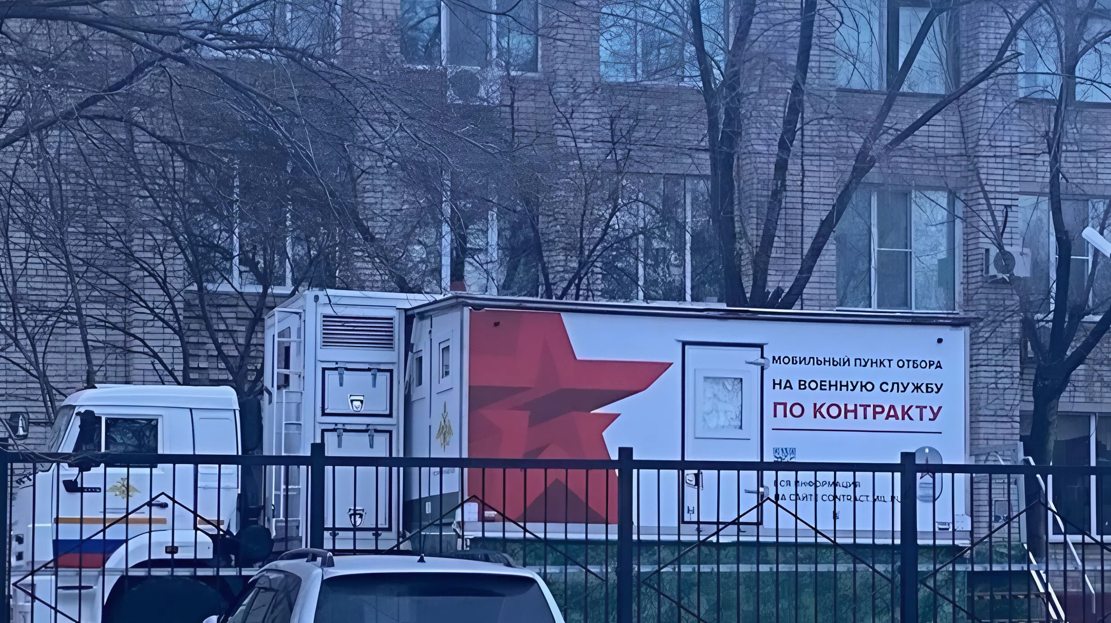 Итак, прямо у входа в здание развернули мобильный пункт отбора на контракт. Над дверями — гигантский баннер, под ним — бегущая строка. Студентов буквально оставляют без выбора, превращая учебные заведения в основной ресурс для пополнения армии.